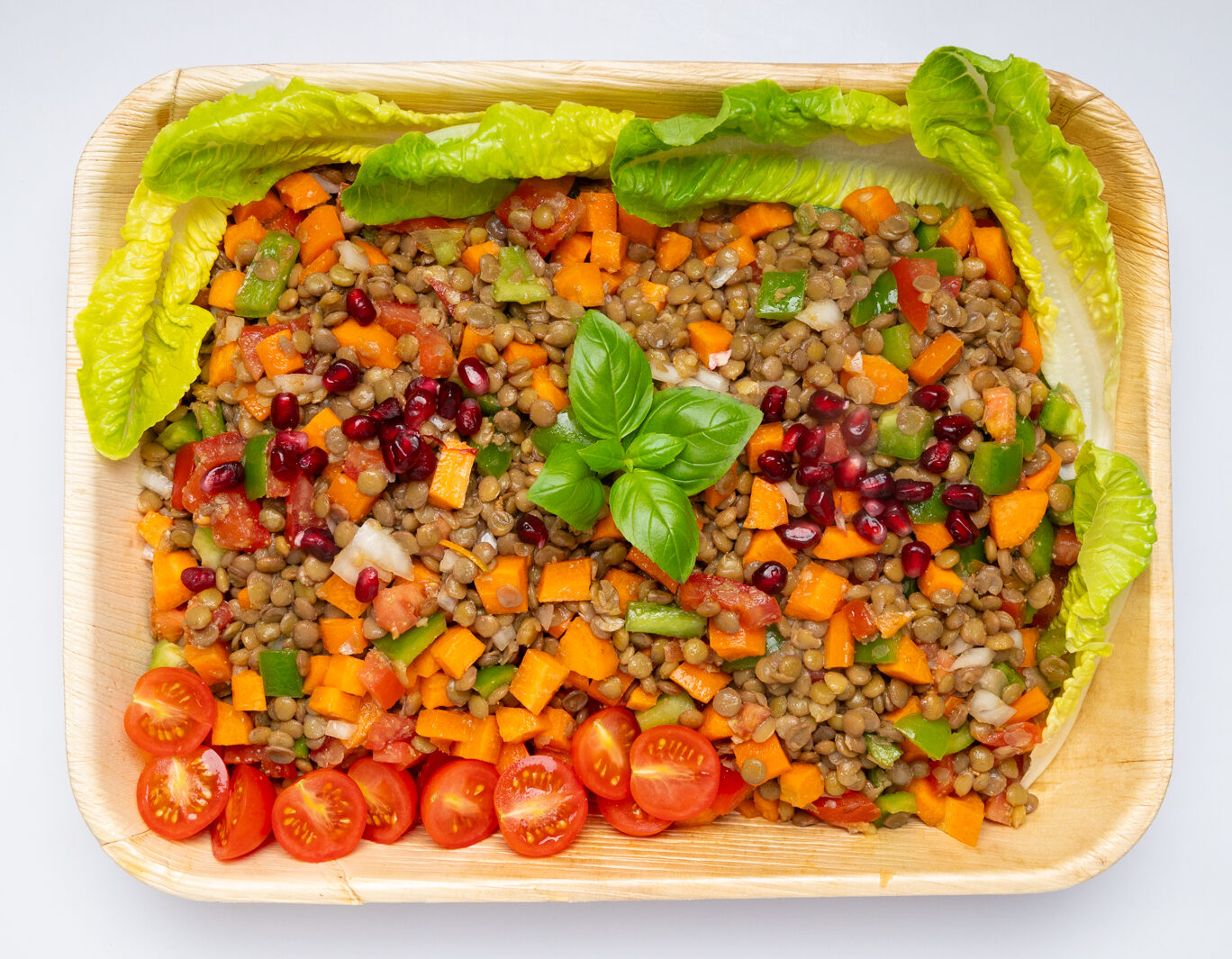 Zutaten: Linsen, Karotten, Paprika, Frühlingszwiebeln, Granatapfelkerne, Zitronensaft, Olivenöl, frische Kräuter, Salz, Pfeffer