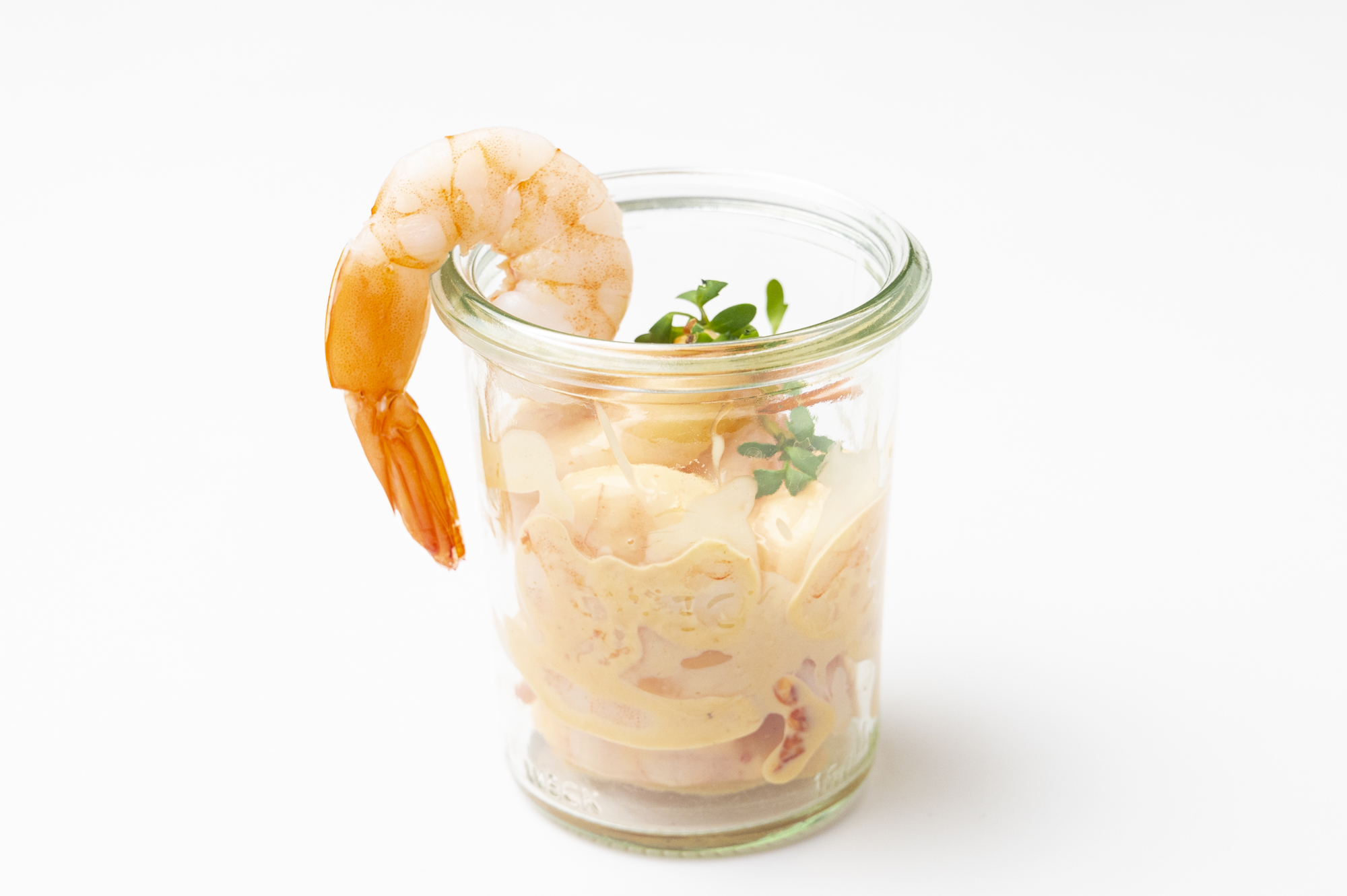 Handwerk: Zarte Garnelen werden schonend gegart und in einer leichten Knoblauchcreme mit Paprika und Chili verfeinert. Sorgfältig angerichtet und serviert im praktischen Weckglas.