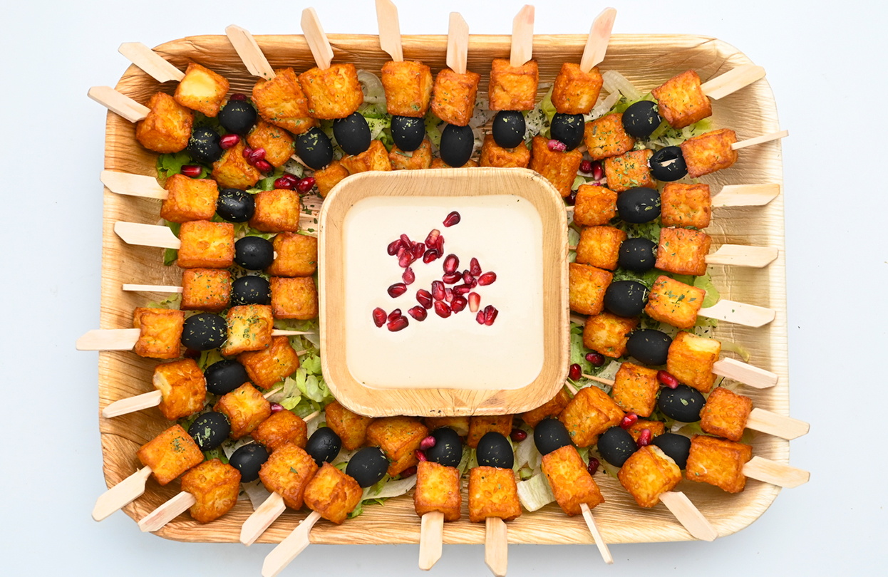 Handwerk: Goldbraun gebratener Halloumi wird in gleichmäßige Würfel geschnitten und mit einer Olive auf Spieße gesteckt. Sorgfältig kombiniert mit frischen Komponenten für eine ausgewogene Präsentation.