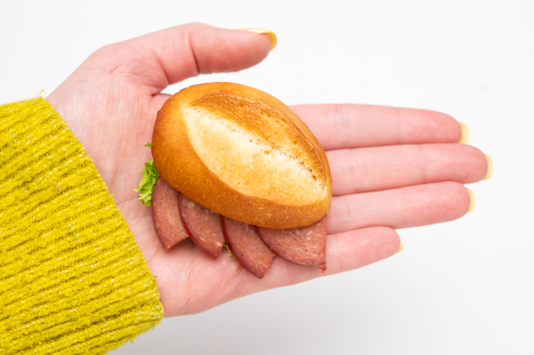 Handwerk: Kleine, locker gebackene Mini Schrippen werden frisch aufgeschnitten und mit würziger Knoblauch Salami belegt. Sorgfältig vorbereitet für ein klassisches und unkompliziertes Fingerfood Erlebnis.