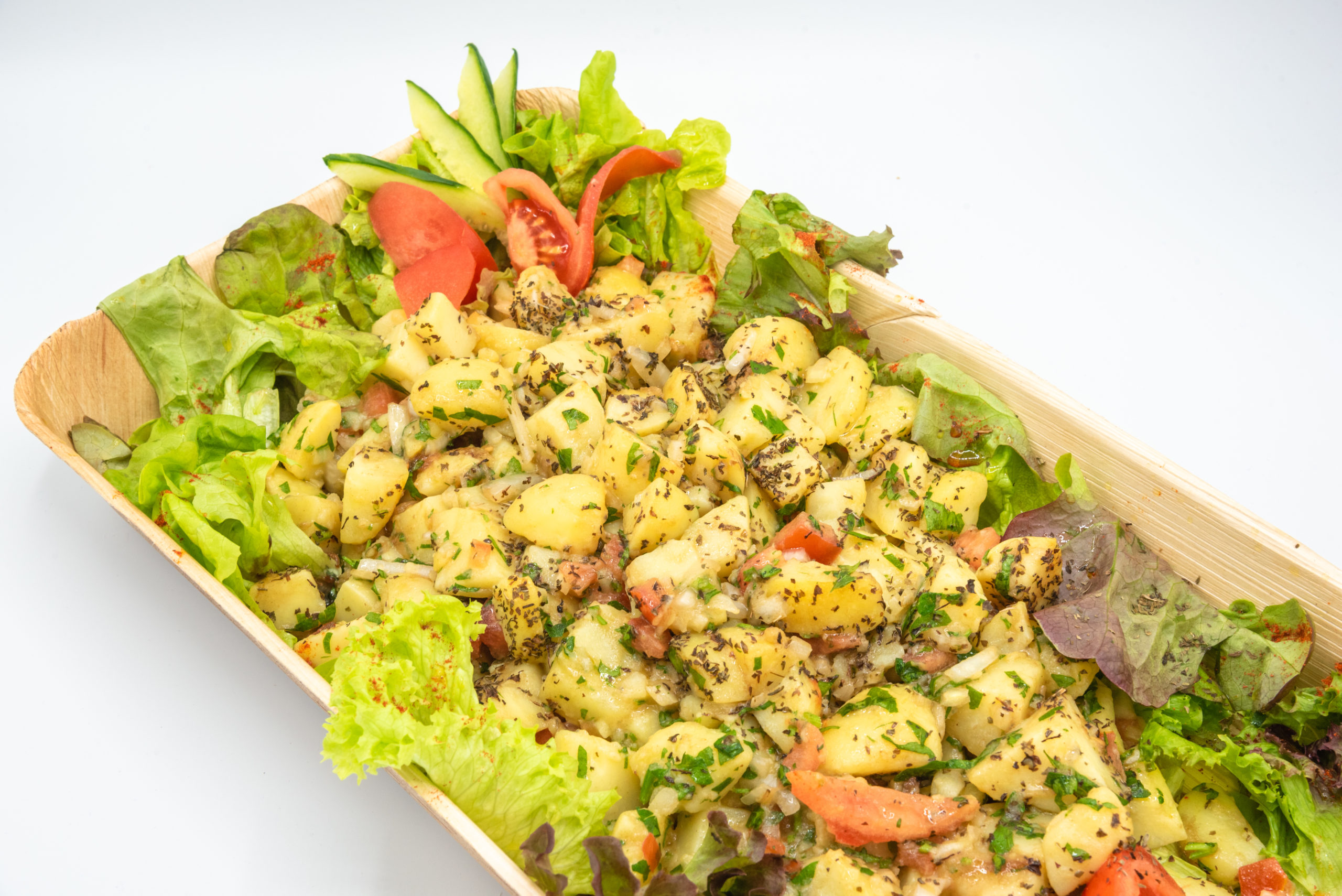 Handwerk: Zart gegarte Kartoffeln, mariniert mit fruchtigen Tomaten, frischen Kräutern und einem milden Gewürzprofil. Leicht cremig ohne Schwere, vegan interpretiert im mediterranen Stil.